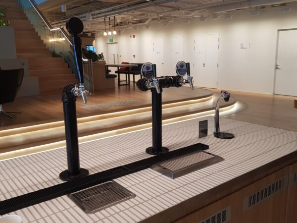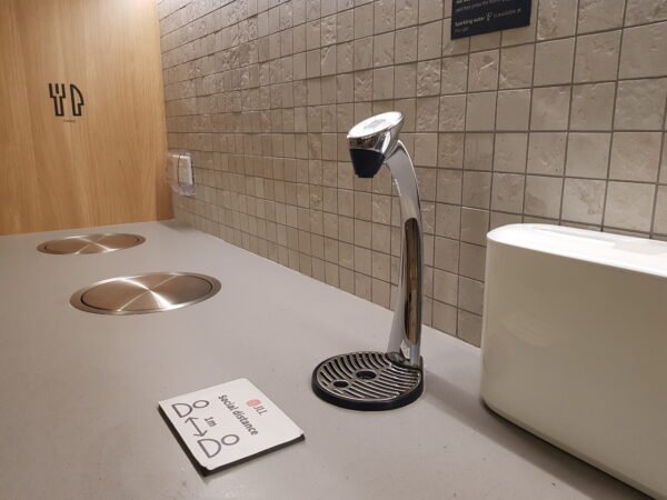 Their interior designer wanted an industrial look for their juice bar and cafe. We came up with a customised tower using industrial pipes and our Perlicks faucets. This 2 faucets tower provides Still and Sparkling water. It is then connected to our Brita Bottler 105, with our cold water filter Brita Purity C1000 AC.