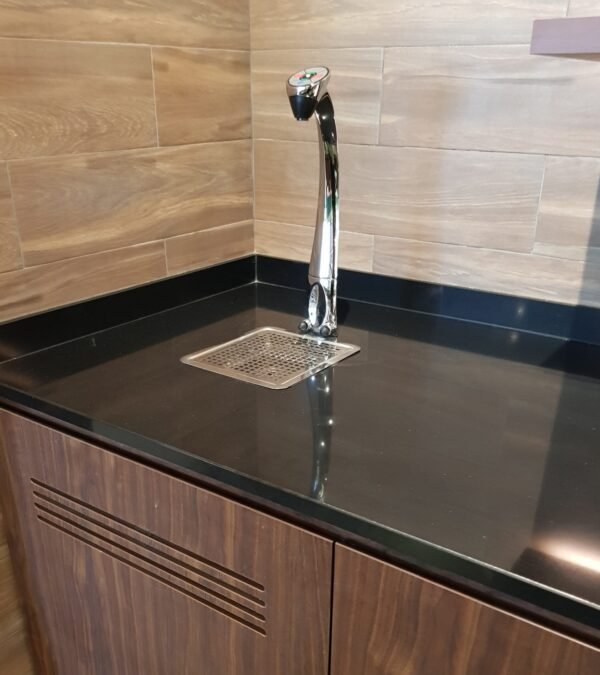 Over at the secret bar, is our standard Brita ViTap 305. Hidden nicely under counter lies the 2 Brita filters, Brita Purity C1000AC and the Brita Purity C300. Using the sub-micron filter, it filters large particles and odour producing chemicals to give you fresh, good tasting water. This is actually a replacement modification from a competitor brand. Due to the larger hole size that was required by the competitor, we had to place an acrylic to cover the unsightly hole and mount our Brita ViTap font.